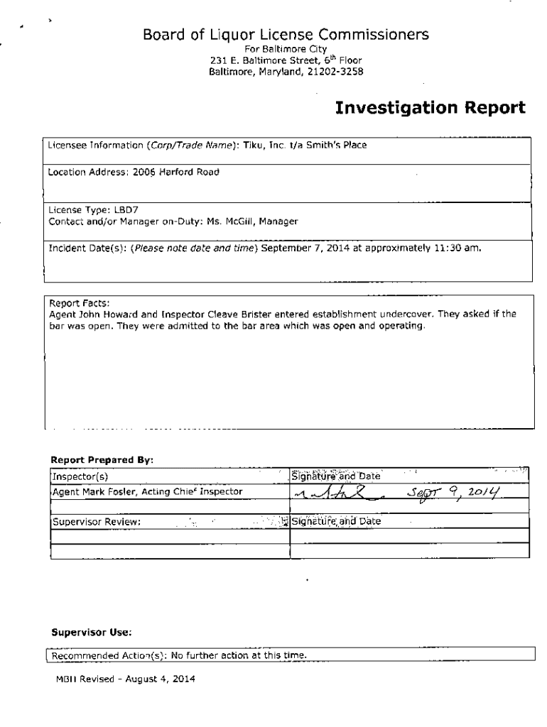 Board of Liquor License Commissioners For Baltimore City 231 E. Baltimore Street, 6th Floor Baltimore, Maryland, 212023258Investigation Report Licensee Information (Corp/Trade Name): Time, Inc. t/a