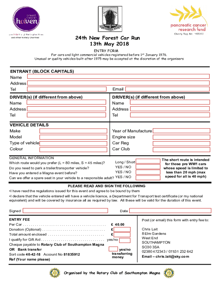 24th New Forest Car Run 13th May 2018and other Rotary CharitiesENTRY FORM For cars and light commercial vehicles registered before 1st January 1976. Unusual or quality vehicles built after 1975 may