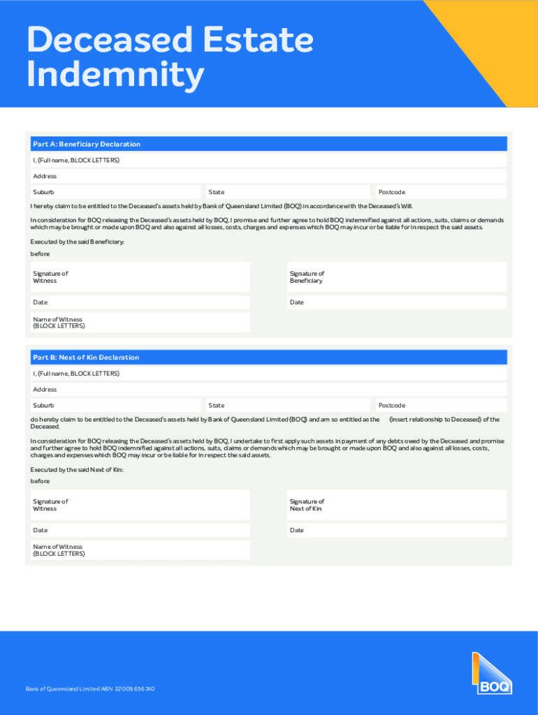 Deceased Estate Indemnity Part A: Beneficiary Declaration, (Full name, BLOCK LETTERS) Address SuburbStatePostcodeI hereby claim to be entitled to the Deceased assets held by Bank of Queensland Limited