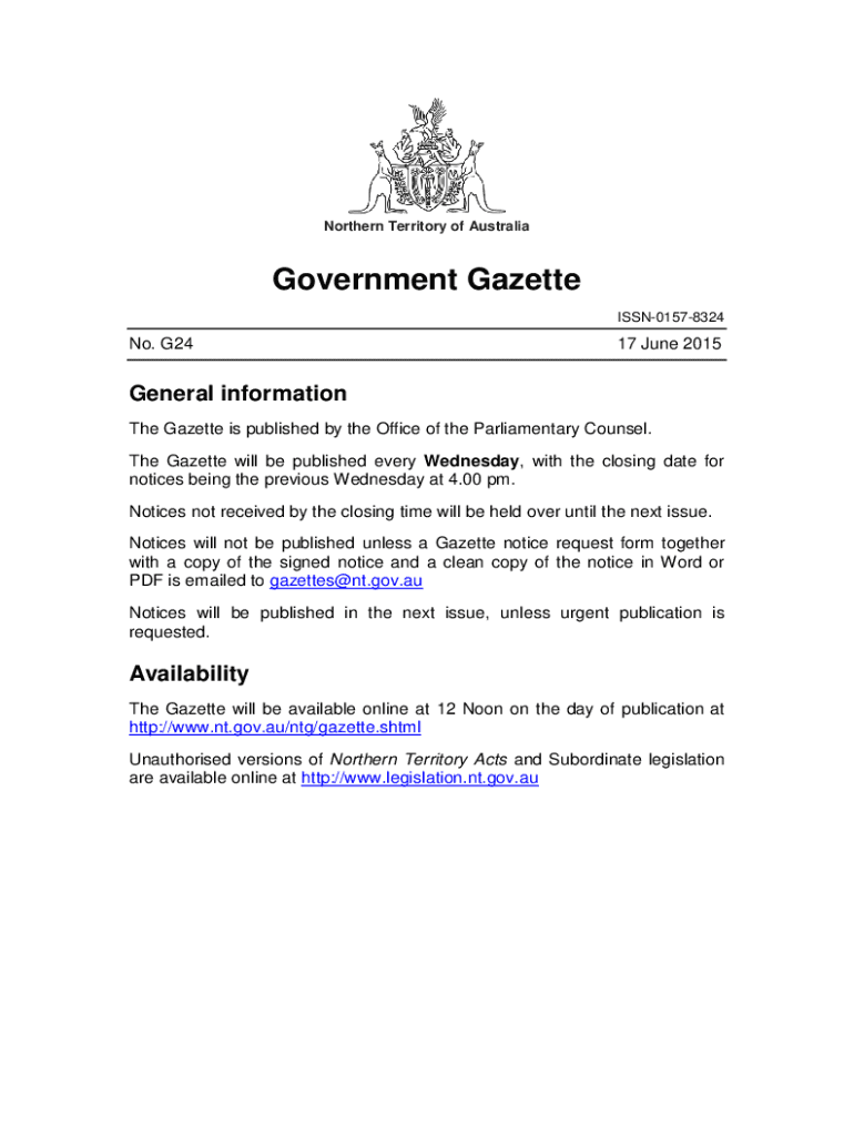 Northern Territory of AustraliaGovernment Gazette ISSN01578324No. G2417 June 2015General information The Gazette is published by the Office of the Parliamentary Counsel. The Gazette will be published