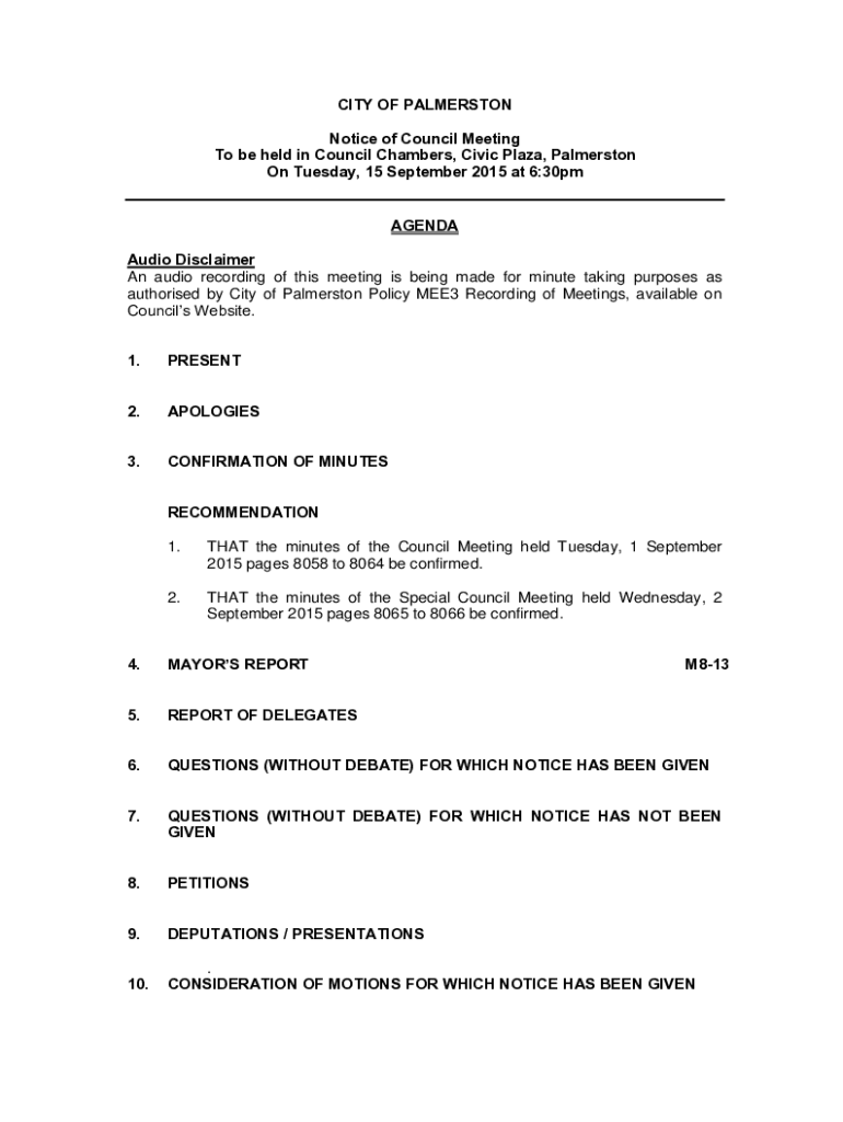CITY OF PALMERSTON Notice of Council Meeting To be held in Council Chambers, Civic Plaza, Palmerston On Tuesday, 15 September 2015 at 6:30pmAGENDA Audio Disclaimer An audio recording of this meeting