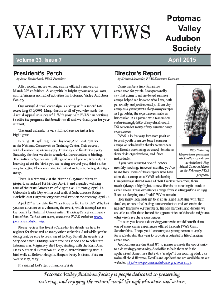 VALLEY VIEWS April 2015Volume 33, Issue 7Presidents Perch by Jane Undertook, PAS PresidentAfter a cold, snowy winter, spring officially arrived on March 20th at 3:46pm. Along with its bright greens