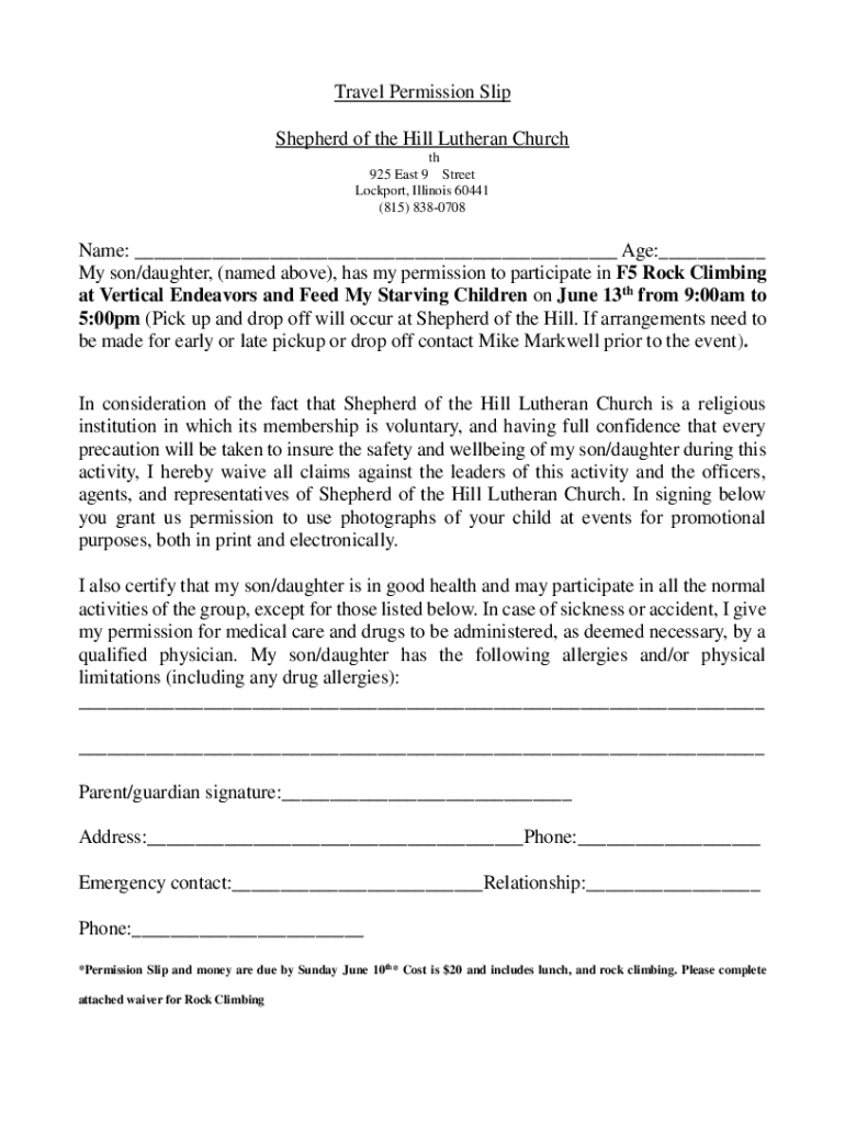Get the free www.shepherdofthehill.com058Travel Permission Slip Shepherd of the Hill Lutheran Church