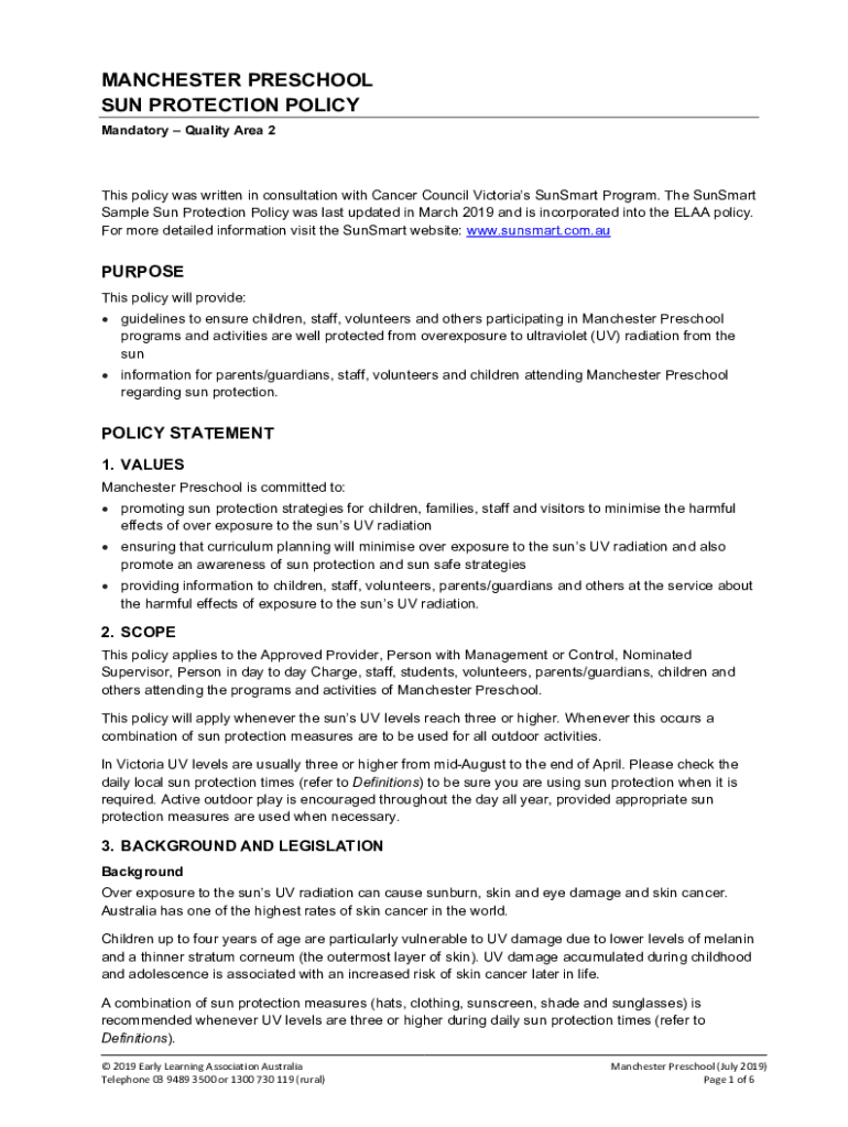 MANCHESTER PRESCHOOL SUN PROTECTION POLICY Mandatory Quality Area 2This policy was written in consultation with Cancer Council Victoria's Sun Smart Program. The Sun Smart Sample Sun Protection Policy
