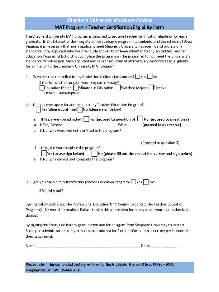 Shepherd University Graduate Studies MAT Program Teacher Certification Eligibility Form The Shepherd University MAT program is designed to provide teacher certification eligibility for each graduate.