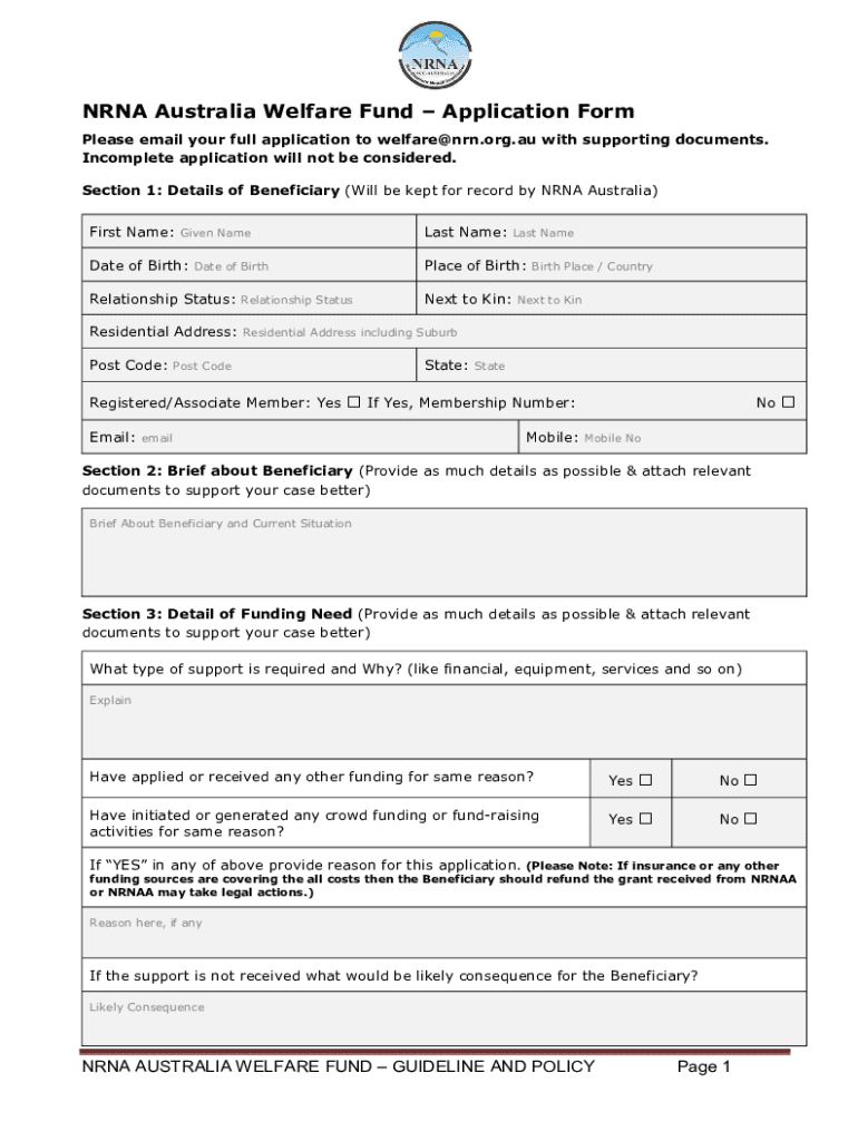 Get the free NRNA Australia - NRNA Australia Welfare Fund Application Form