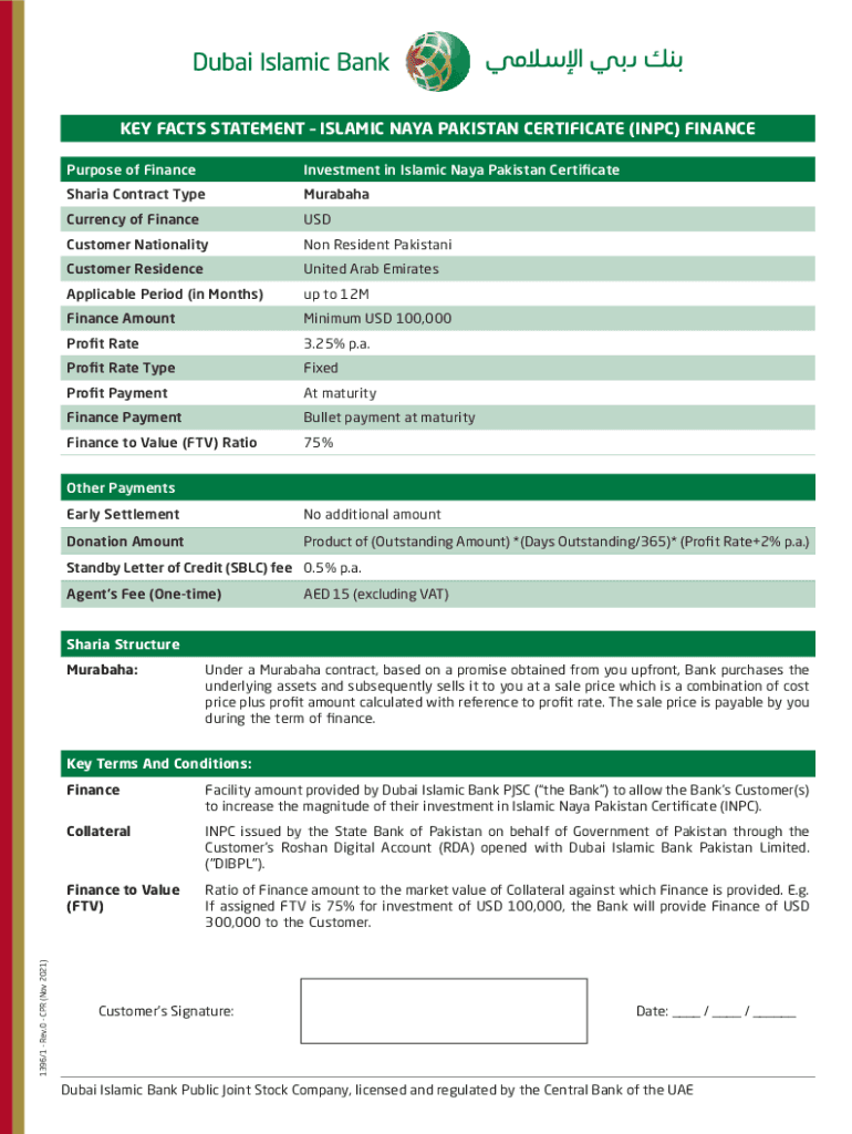 KEY FACTS STATEMENT ISLAMIC NASA PAKISTAN CERTIFICATE (NPC) FINANCE Purpose of FinanceInvestment in Islamic NASA Pakistan CerticateSharia Contract TypeMurabahaCurrency of FinanceUSDCustomer Nationality