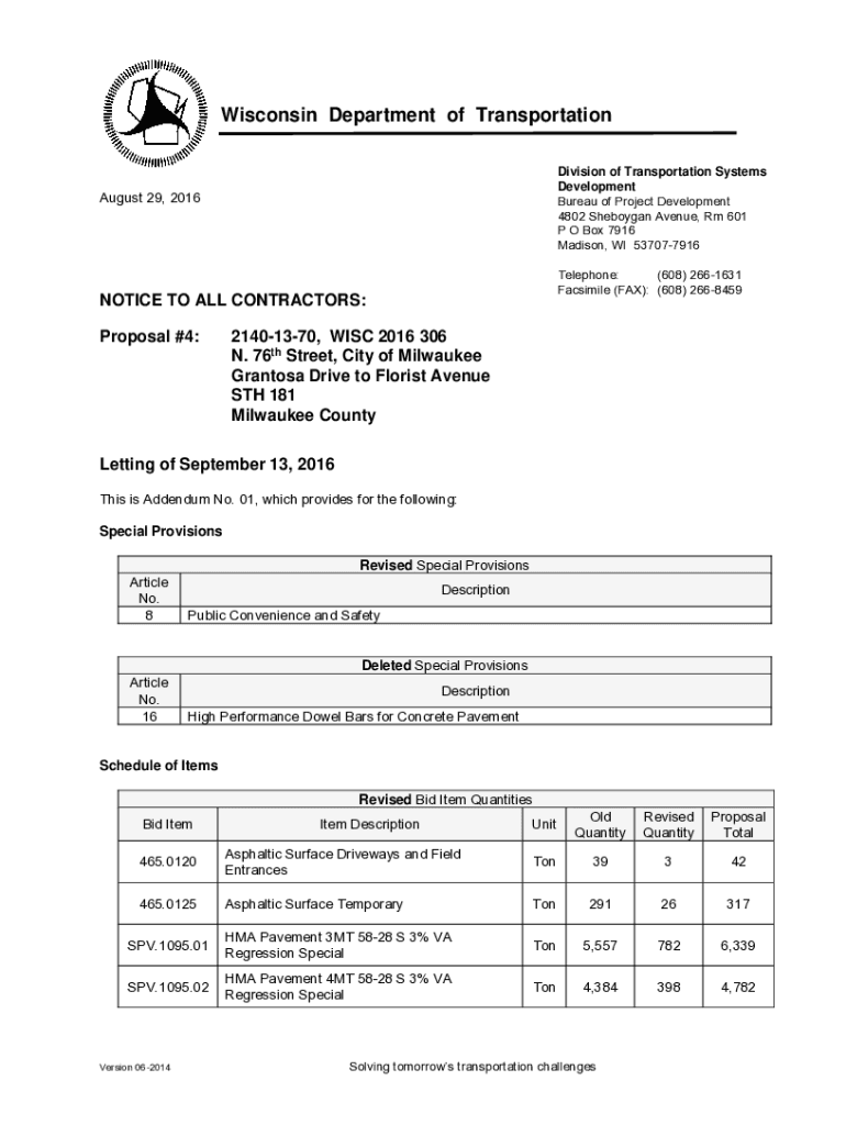 Wisconsin Department of Transportation Division of Transportation Systems Development Bureau of Project Development 4802 Sheboygan Avenue, Rm 601 P O Box 7916 Madison, WI 537077916August 29, 2016Telephone: