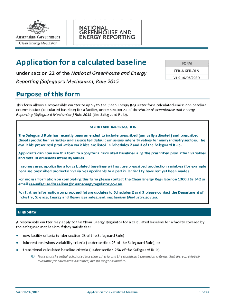 Application for a calculated baseline under section 22 of the National Greenhouse and Energy Reporting (Safeguard Mechanism) Rule 2015FORMCERNGER015 V4.0 16/06/2020Purpose of this form allows a responsible