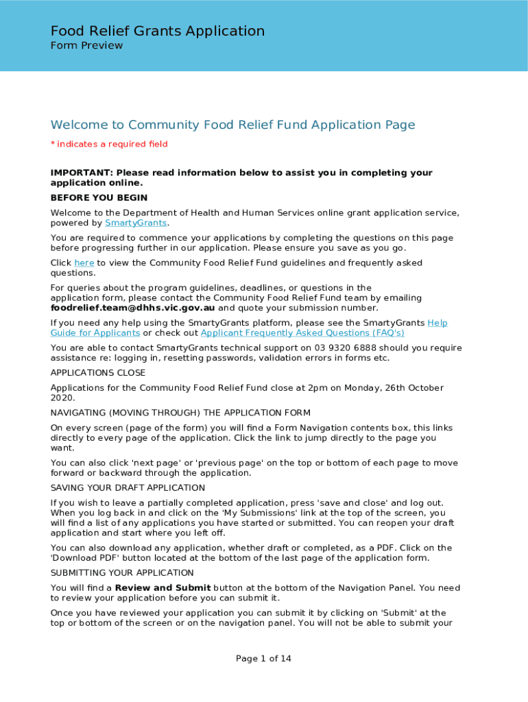 Food Relief Grants Application Form PreviewWelcome to Community Food Relief Fund Application Page * indicates a required ELD IMPORTANT: Please read information below to assist you in completing your