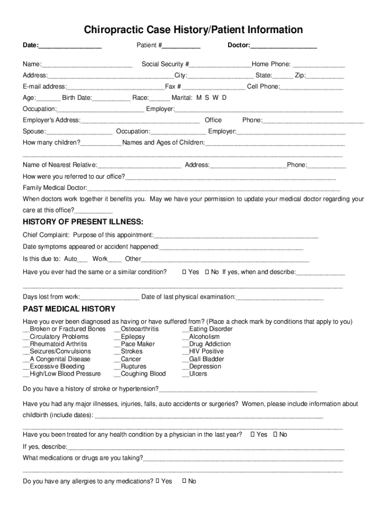 Chiropractic Case History/Patient Information Date:___ Name:___Patient #___Doctor:___Social Security #___Home Phone: ___Address:___City:___ State:___ Zip:___ Email address:___Fax # ___ Cell Phone:___