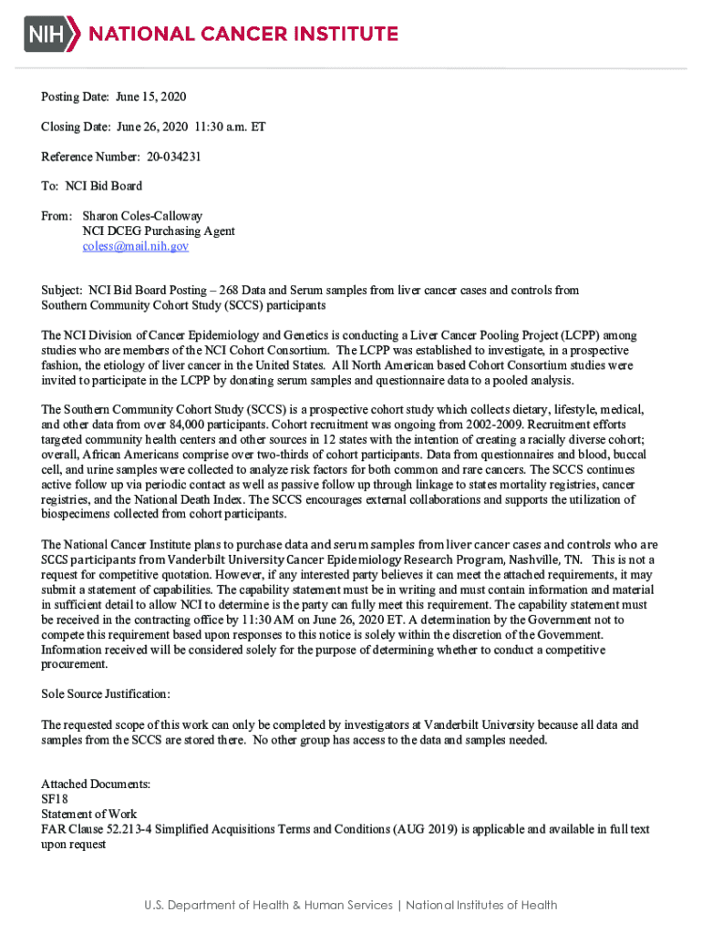 Posting Date: June 15, 2020, Closing Date: June 26, 2020 11:30 a.m. ET Reference Number: 20034231 To: NCI Bid Board From: Sharon ColesCalloway NCI DCE Purchasing Agent coless@mail.nih.gov Subject: