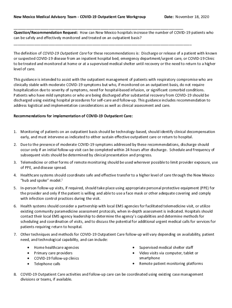 New Mexico Medical Advisory Team COVID-19 Outpatient Care WorkgroupDate: November 18, 2020___ Question/Recommendation Request: How can New Mexico hospitals increase the number of COVID-19 patients