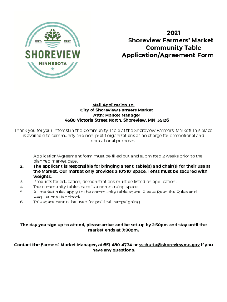 2021 Shore view Farmers Market Community Table Application/Agreement Formal Application To: City of Shore view Farmers Market Attn: Market Manager 4580 Victoria Street North, Shore view, MN 55126