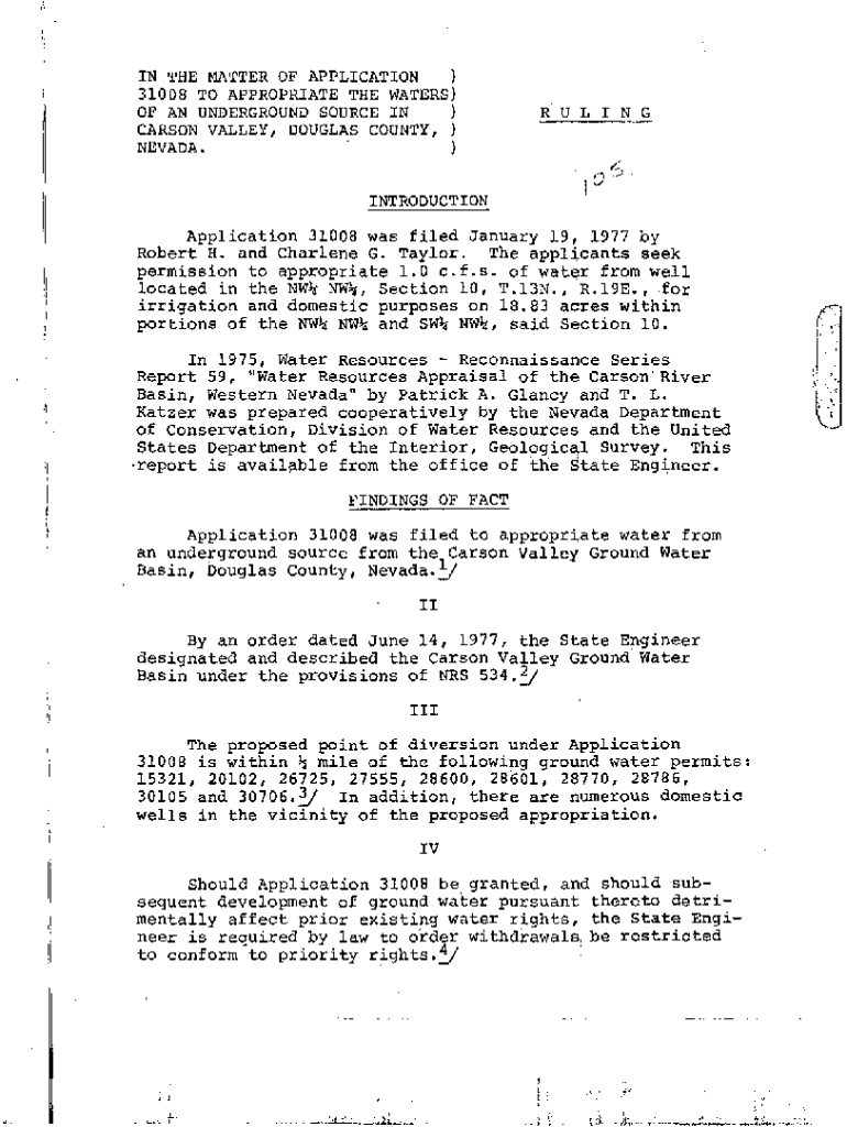 I.IN THE MATTER OF APPLICATION) 31008 TO APPROPRIATE THE WATERS) OF AN UNDERGROUND SOURCE IN) CARSON VALLEY, DOUGLAS COUNTY, ) NEVADA. )R U LING INTRODUCTION Application 3100B was filed January 19,