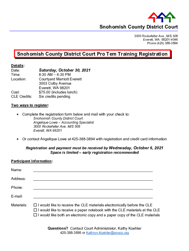 Snohomish County District Court 3000 Rockefeller Ave., M/S 508 Everett, WA 982014046 Phone (425) 3883894Snohomish County District Court Pro Tem Training Registration Details: Date: Time: Location: