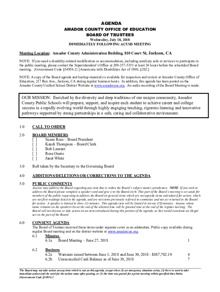 AGENDA AMADOR COUNTY OFFICE OF EDUCATION BOARD OF TRUSTEES Wednesday, July 18, 2018, IMMEDIATELY FOLLOWING AC USD MEETINGMeeting Location: Amador County Administration Building, 810 Court St, Jackson,