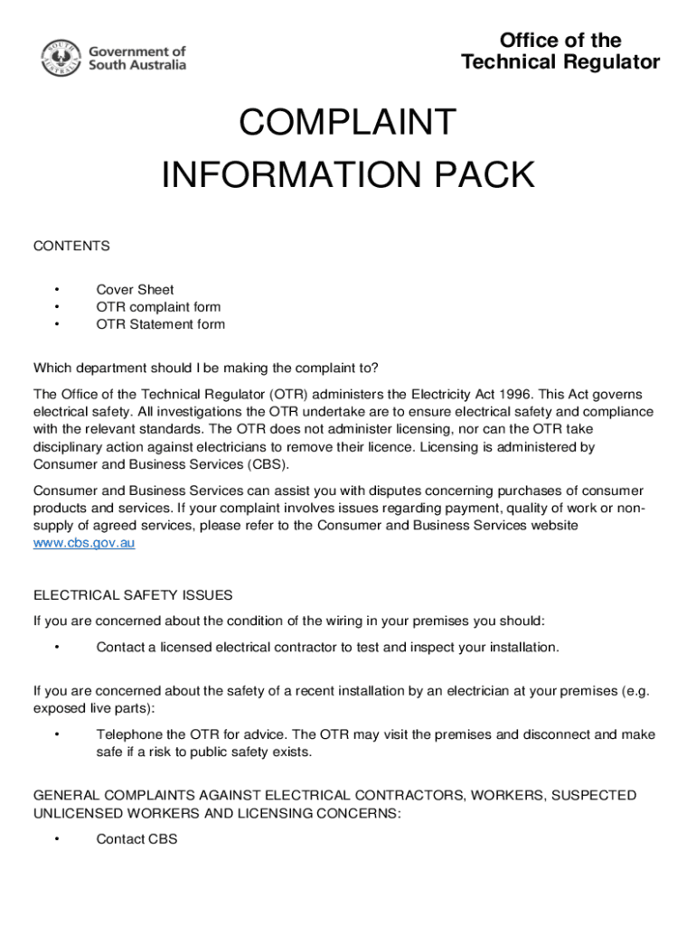 Office of the Technical RegulatorCOMPLAINT INFORMATION PACK CONTENTS Cover Sheet OR complaint form OR Statement Norwich department should I be making the complaint to? The Office of the Technical