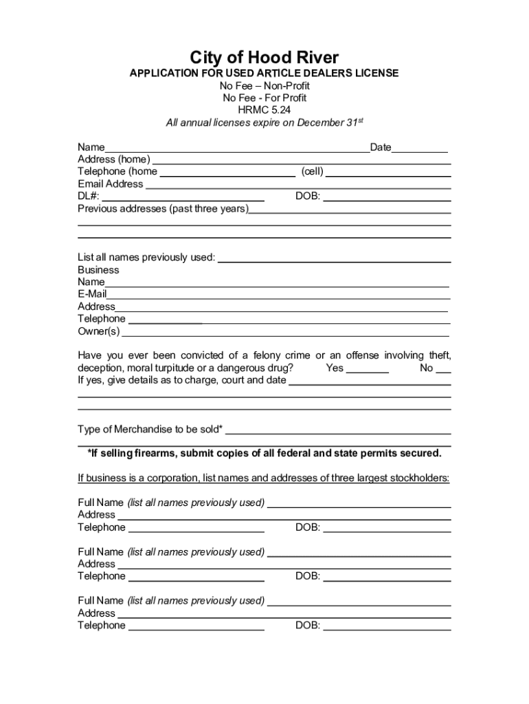 City of Hood Reapplication FOR USED ARTICLE DEALERS LICENSE No Fee Nonprofit No Fee For Profit HMC 5.24 All annual licenses expire on December 31st Name___Date___ Address (home) Telephone (home (cell)