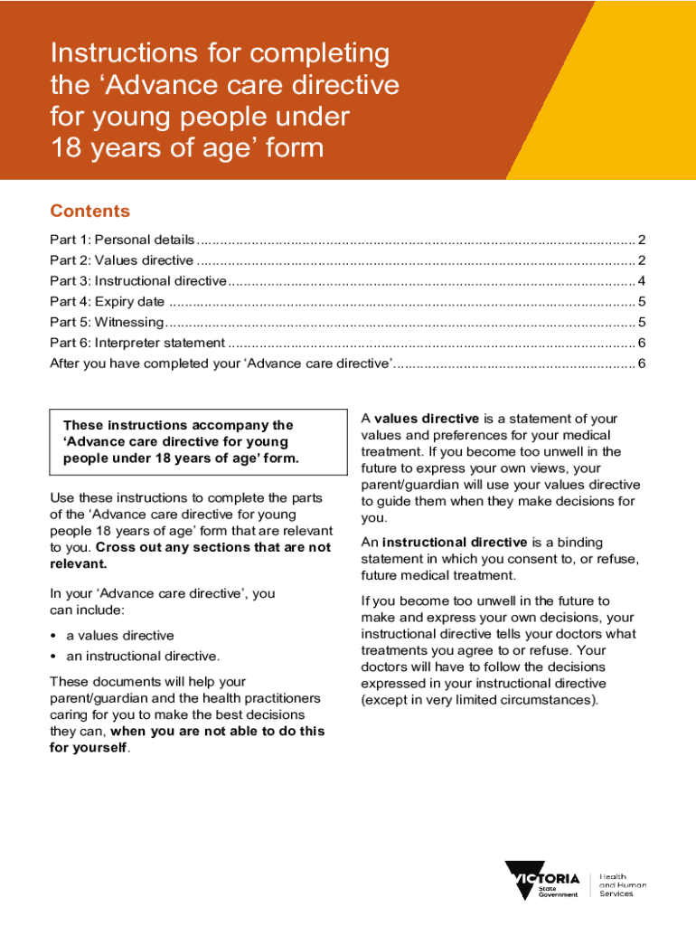Instructions for completing the Advance care directive for young people under 18 years of age form Contents Part 1: Personal details ................................................................................................................