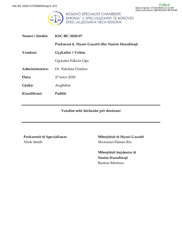 PUBLICKSCBC202007/F00059/ski/1 of 9Numri I end:Date original: 27/10/2020 22:12:00 Date translation: 08/09/2021 08:54:00KSCBC202007 Procurer k. Hymn Ducati the Na sim HaradinajtVendosi:Gjykatsi I Veto