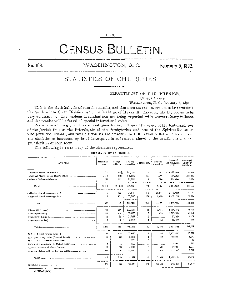 [7010]CENSUS BULLETIN. WASHINGTON, D. C. No. 159. February 5, 1892.STATISTICS OF CHURCHES. DEPARTMENT OF THE INTERIOR, CENSUS OFFICE, IV WASHINGTON, D. C., January 8, I 892. This is the sixth bulletin