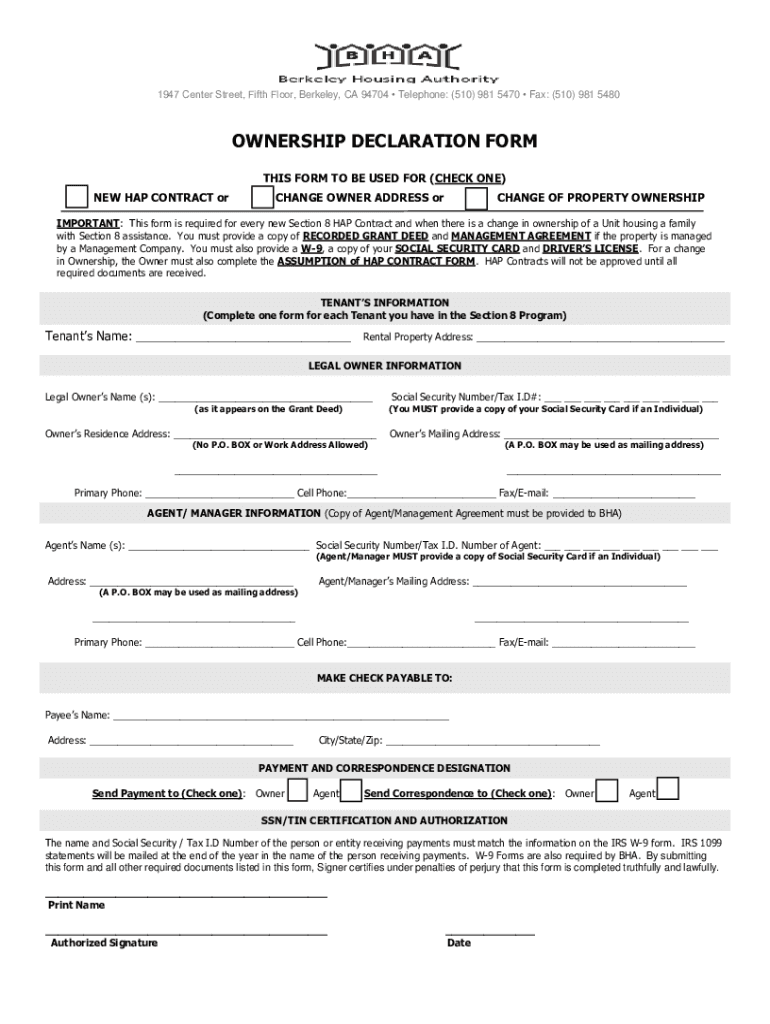1947 Center Street, Fifth Floor, Berkeley, CA 94704 Telephone: (510) 981 5470 Fax: (510) 981 5480OWNERSHIP DECLARATION FORM THIS FORM TO BE USED FOR (CHECK ONE) NEW HAP CONTRACT change OWNER ADDRESS