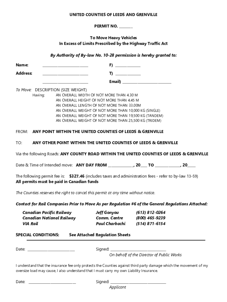 UNITED COUNTIES OF LEEDS AND GRENVILLE PERMIT NO. ___ To Move Heavy Vehicles In Excess of Limits Prescribed by the Highway Traffic Act By Authority of Bylaw No. 1028 permission is hereby granted to: