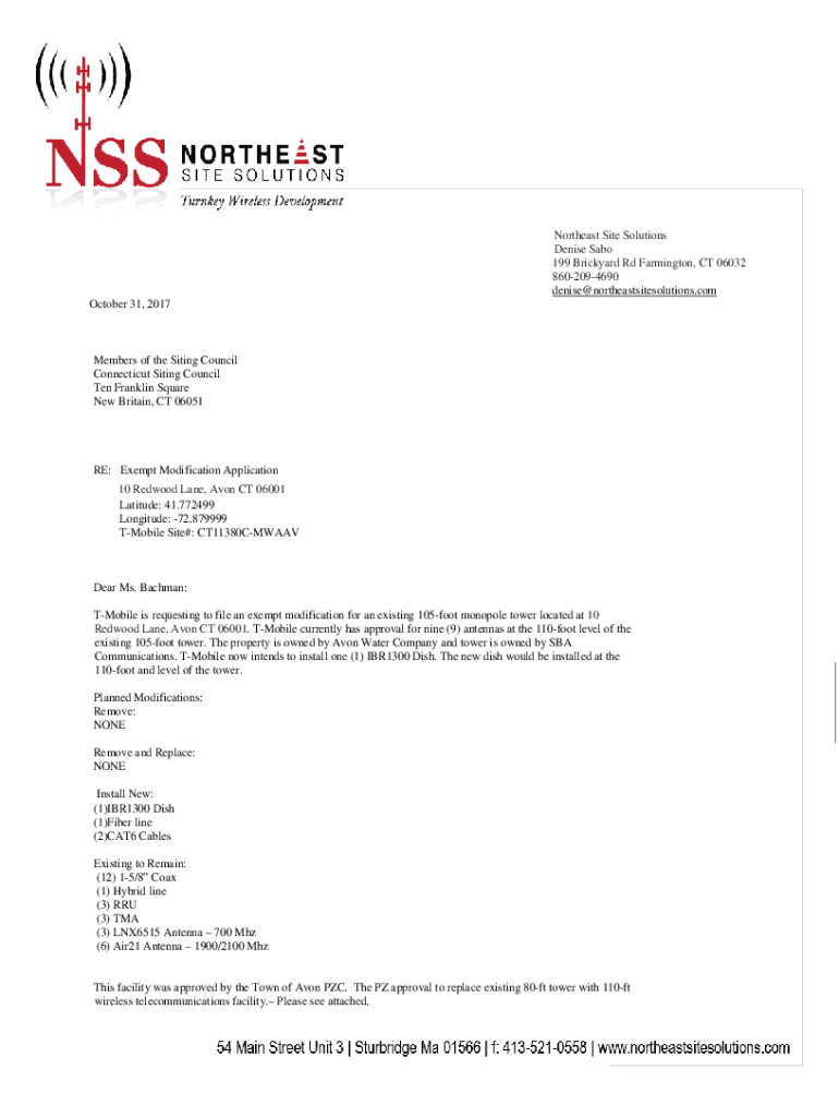 Northeast Site Solutions Denise Sago 199 Brickyard Rd Farmington, CT 06032 8602094690 denise@northeastsitesolutions.com October 31, 2017Members of the Siting Council Connecticut Siting Council Ten