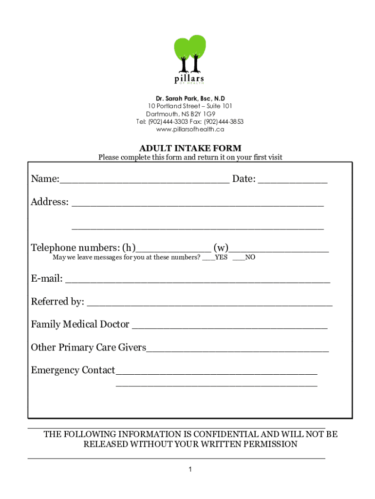 Dr. Sarah Park, BSC, N. D 10 Portland Street Suite 101 Dartmouth, NS B2Y 1G9 Tel: (902)4443303 Fax: (902)4443853 www.pillarsofhealth.caADULT INTAKE Formulas complete this form and return it on your