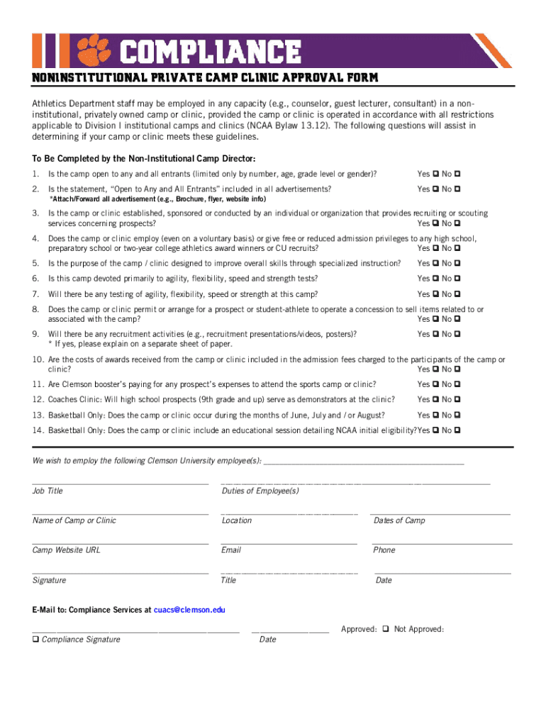 Get the free NonInstitutional Private Camp/Clinic Approval Form - Clemson Tigers