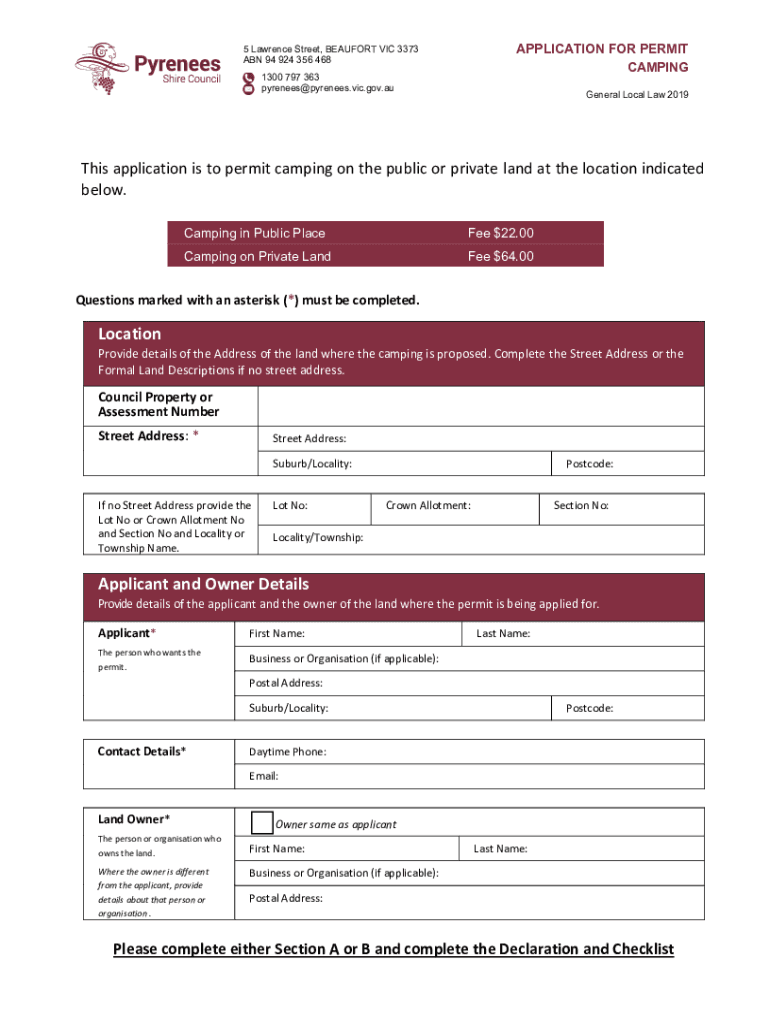 APPLICATION FOR PERMIT CAMPING5 Lawrence Street, BEAUFORT VIC 3373 ABN 94 924 356 468 1300 797 363 pyrenees@pyrenees.vic.gov.auGeneral Local Law 2019 Thisapplicationistopermitcampingonthepublicorprivatelandatthelocationindicated