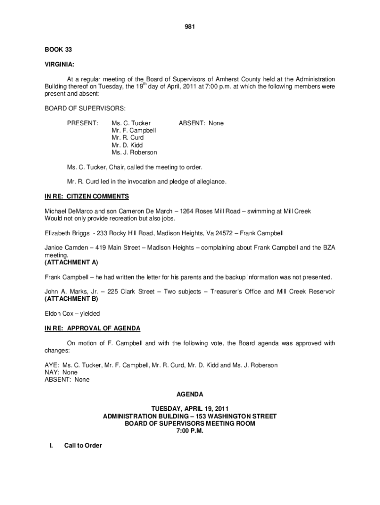 981BOOK 33 VIRGINIA: At a regular meeting of the Board of Supervisors of Amherst County held at the Administration TH Building thereof on Tuesday, the 19 day of April 2011 at 7:00 p.m. at which the