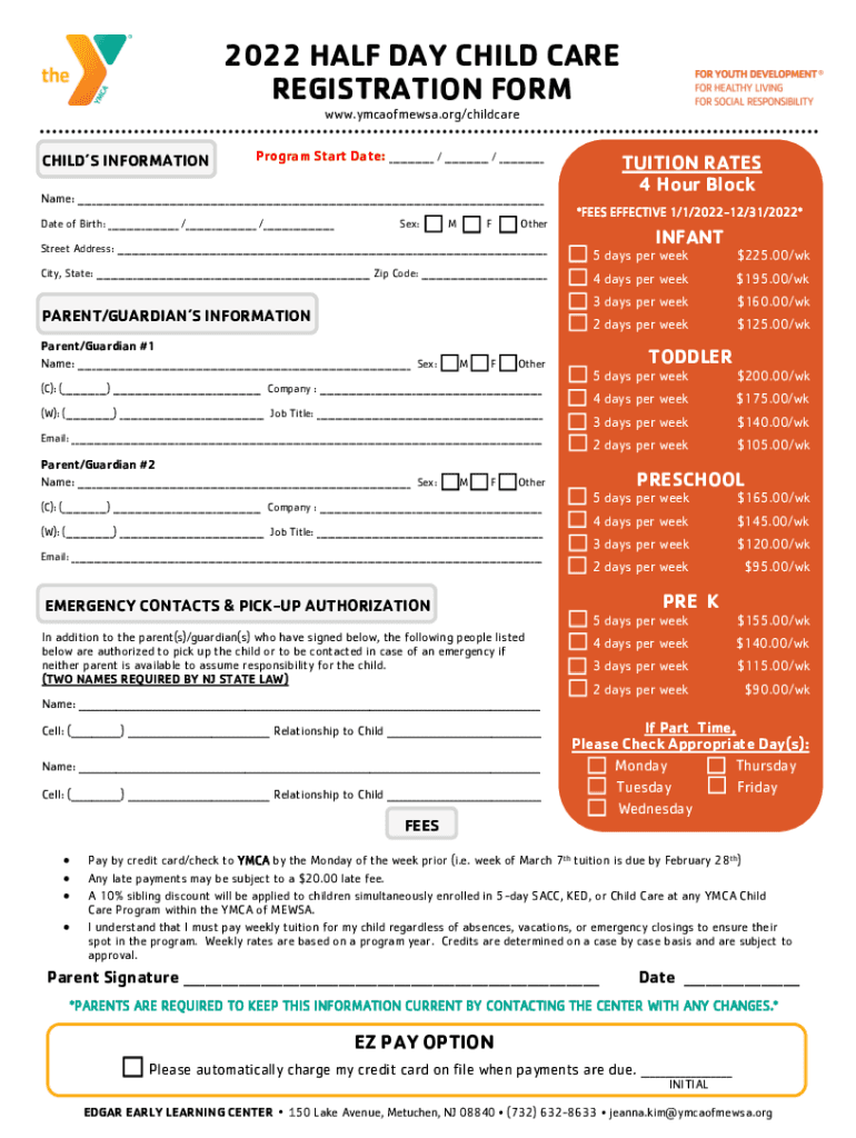 2022 HALF DAY CHILD CARE REGISTRATION FORM www.ymcaofmewsa.org/childcareCHILDS INFORMATIONProgram Start Date: ___ / ___ / ___TUITION RATES 4 Hour Blockade: ___ Date of Birth: ___ /___ /___Sex:Mother×FEES