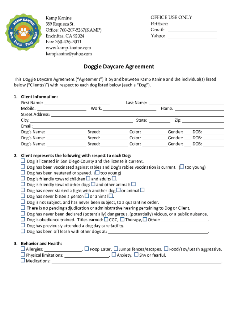 Camp Canine 389 Request St. Office: 7602075267(CAMP) Tendinitis, CA 92024 Fax: 7604363011 www.kampkanine.com kampkanine@yahoo.comOFFICE USE ONLY Petered: ___ Gmail: ___ Yahoo: ___Dog Daycare Agreement