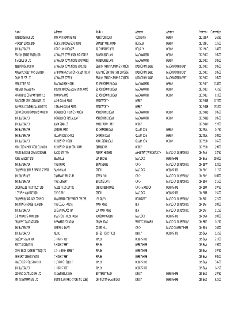 Name INTERIORS BY JK LTD HORSEY LODGE LTD THE RATEPAYER SEVERN TRENT WATER LTD T MOBILE UK LTD TELEFONICA UK LTD AIRWAVES SOLUTIONS LIMITED ORANGE PCS LTD MARTIN\'S PLC PREMIER TRAVEL INN PUNCH PUB