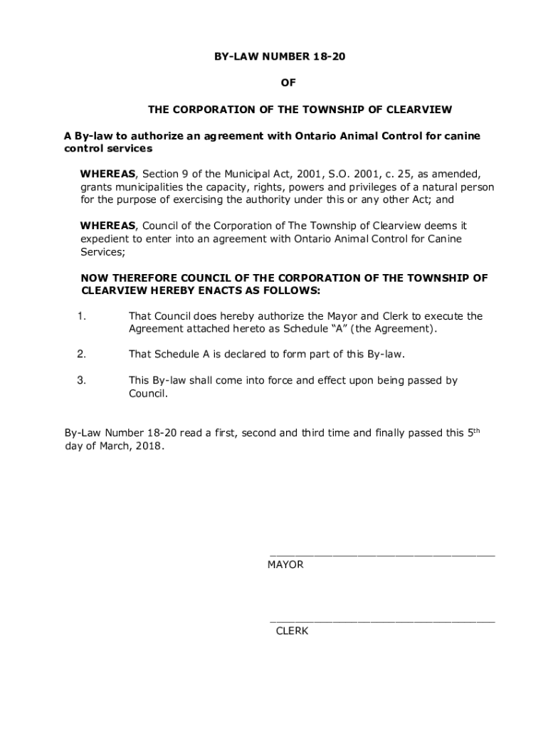 BYLAW NUMBER 1820 OF THE CORPORATION OF THE TOWNSHIP OF CLEARVIEW A Bylaw to authorize an agreement with Ontario Animal Control for canine control services WHEREAS, Section 9 of the Municipal Act,