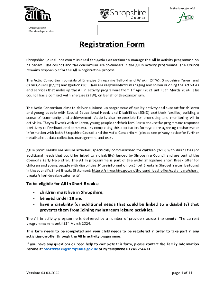 In Partnership withOffice use only Membership numberRegistration Form Shropshire Council has commissioned the Action Consortium to manage the All In activity program on its behalf. The council and
