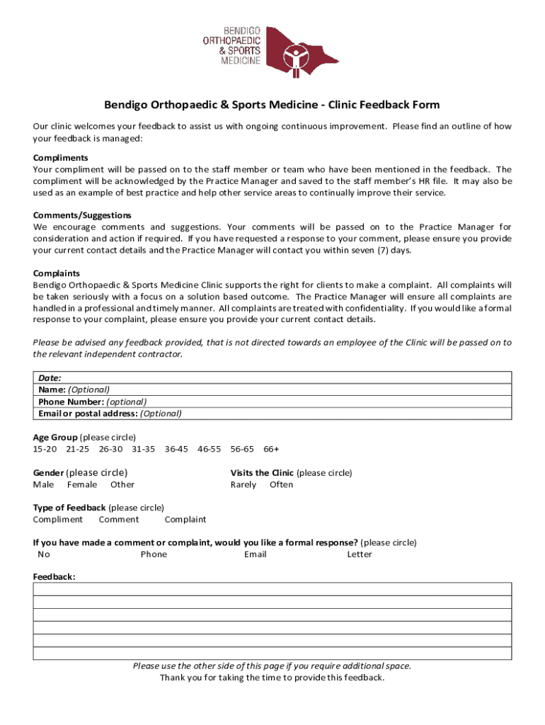 Bendigo Orthopedic & Sports Medicine Clinic Feedback Form Our clinic welcomes your feedback to assist us with ongoing continuous improvement. Please find an outline of how your feedback is managed: