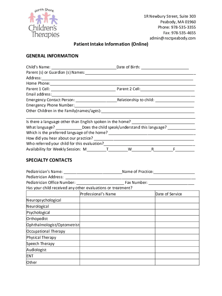1R Newbury Street, Suite 303 Peabody, MA 01960 Phone: 9785353355 Fax: 9785354655 admin@nsctpeabody.comPatient Intake Information (Online) GENERAL INFORMATION Child's Name: ___Date of Birth: ___ Parent