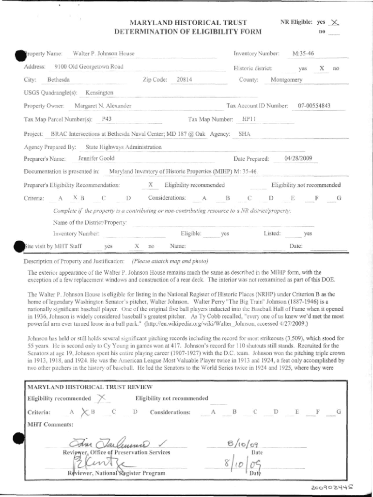 NR Eligible: Maryland HISTORICAL TRUST DETERMINATION OF ELIGIBILITY FORM Property Name: Address: City:Walter P. Johnson Housetop Code:Property Owner:County:Margaret N. AlexanderPreparer\'s Name:P43Tax