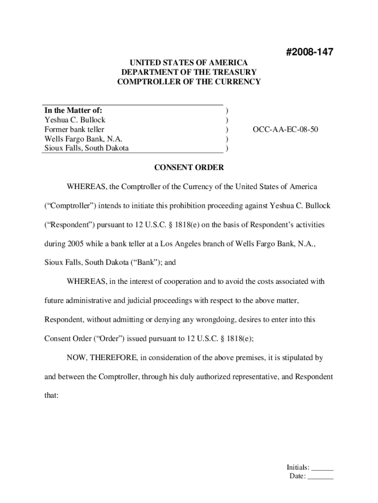 #2008147 UNITED STATES OF AMERICA DEPARTMENT OF THE TREASURY COMPTROLLER OF THE CURRENCY)))))In the Matter of: Jeshua C. Bullock Former bank teller Wells Fargo Bank, N.A. Sioux Falls, South DakotaOCCAAEC0850CONSENT
