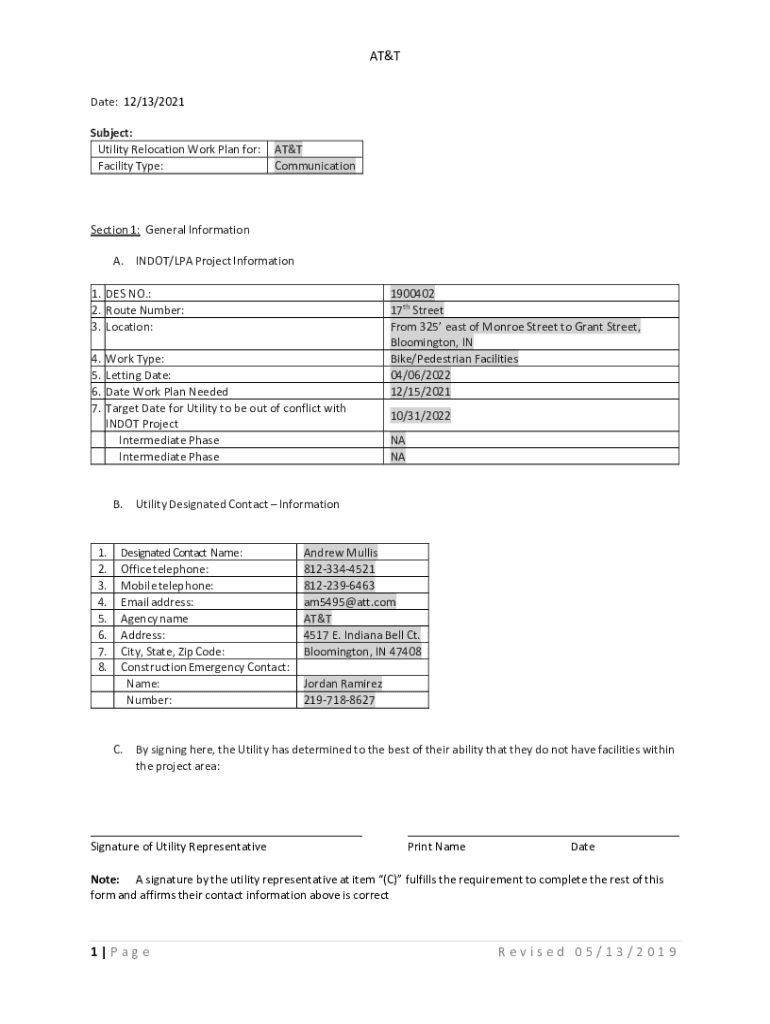 AT&T Date: 12/13/2021 Subject: Utility Relocation Work Plan for: Facility Type:AT&T CommunicationSection 1: General Information A. INGOT/PA Project Information 1. DES NO.: 2. Route Number: 3. Location: