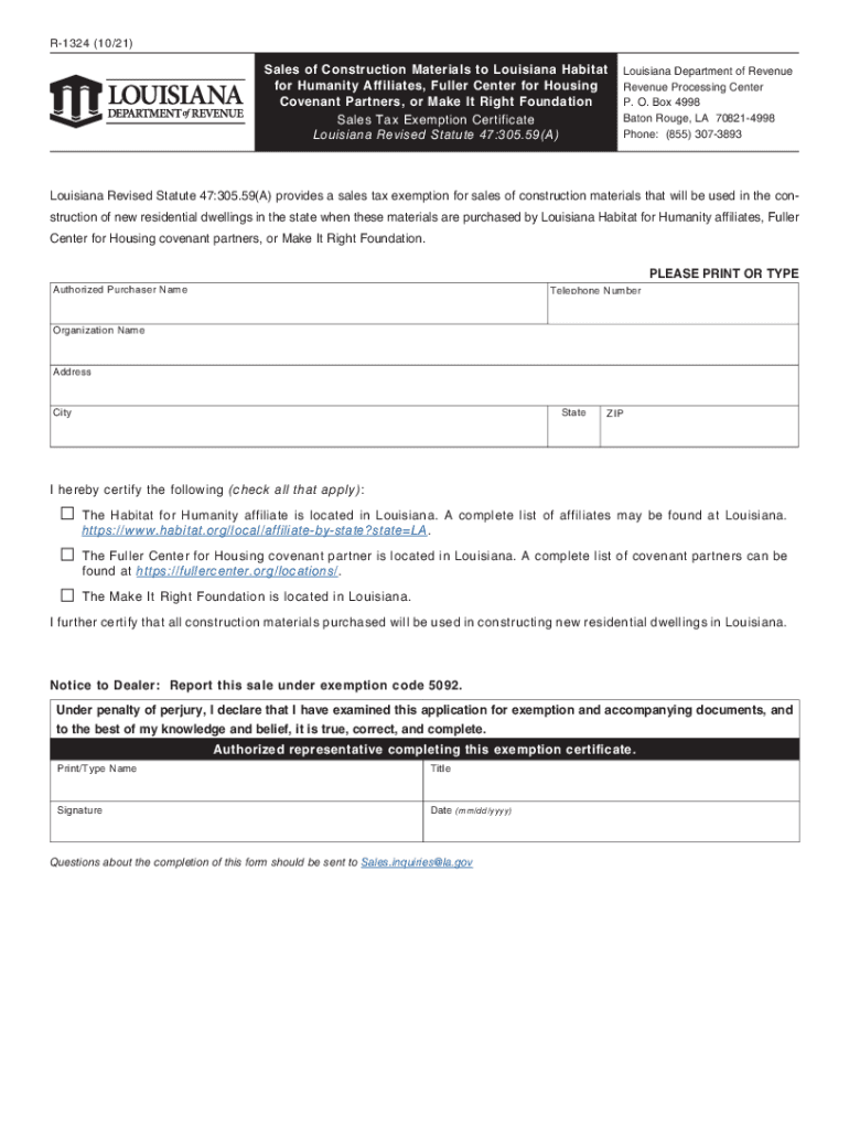 R1324 (10/21)Sales of Construction Materials to Louisiana Habitat for Humanity Affiliates, Fuller Center for Housing Covenant Partners, or Make It Right Foundation Sales Tax Exemption Certificate