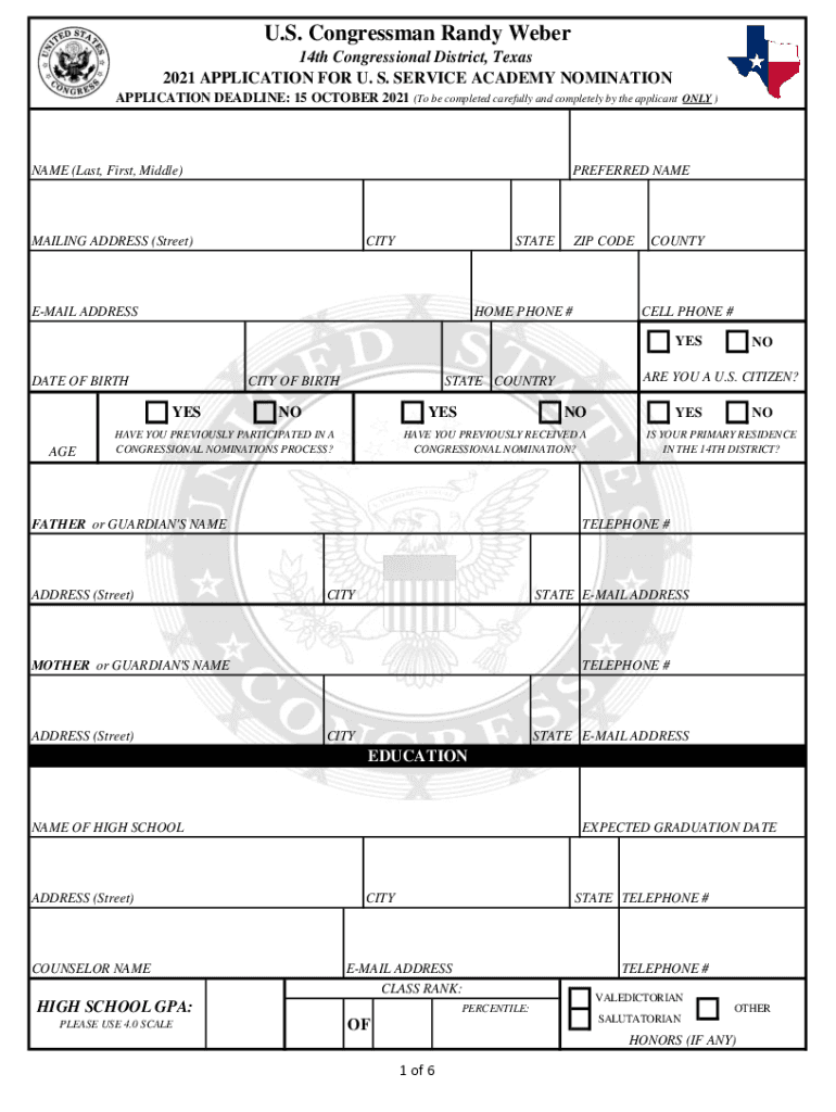 2021 APPLICATION FOR U. S. SERVICE ACADEMY NOMINATION