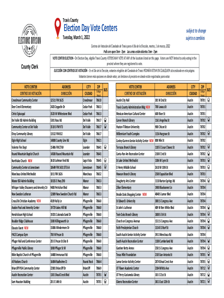 Travis Counteraction Day Vote Centers subject to change surety a cambiosTuesday, March 1, 2022County Clerk VOTE CENTER CENTR ODE VITAMIN Creed moor Community Center Deer Creek Elementary Christ Episcopal