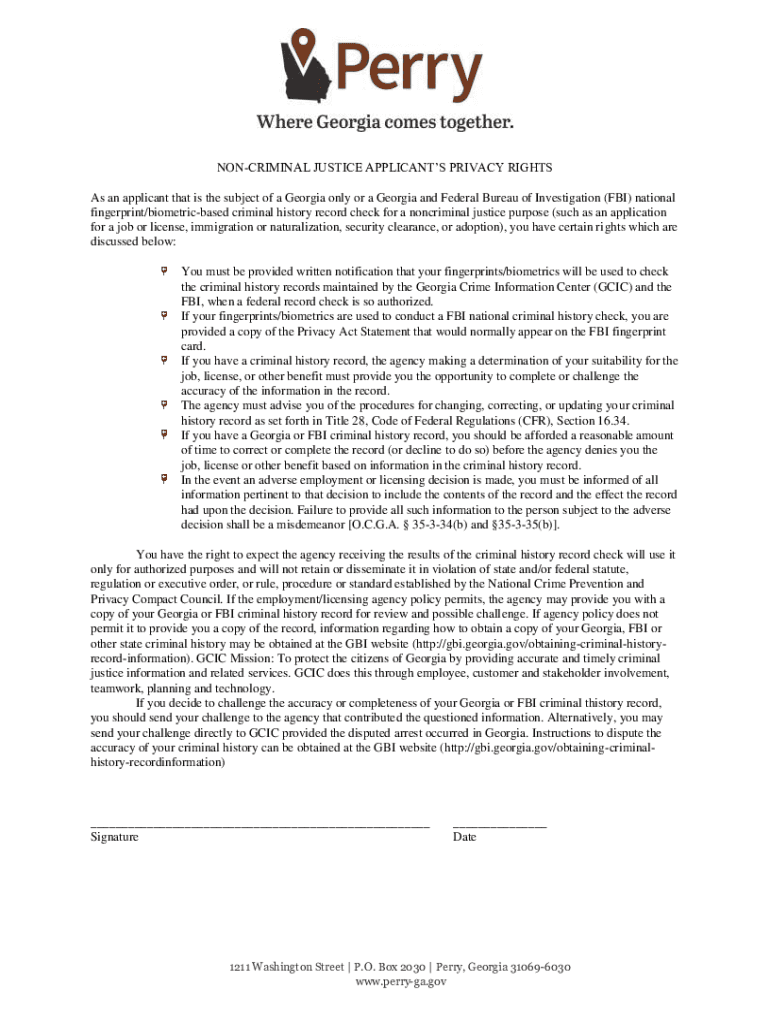 NONCRIMINAL JUSTICE APPLICANTS PRIVACY RIGHTS As an applicant that is the subject of a Georgia only or a Georgia and Federal Bureau of Investigation (FBI) national fingerprint/biometricbased criminal