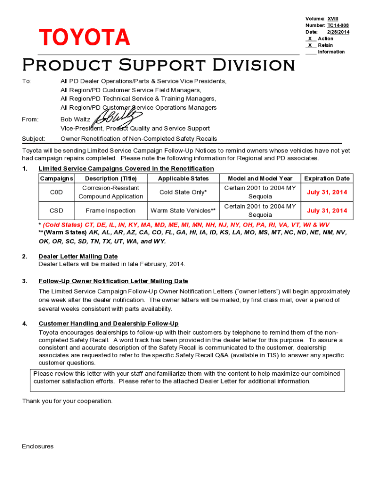 Volume: XVIII Number: TC14008 2/28/2014 Date: X Action X Retain InformationTOYOTA Product Support Division To:All PD Dealer Operations/Parts & Service Vice Presidents, All Region/PD Customer Service