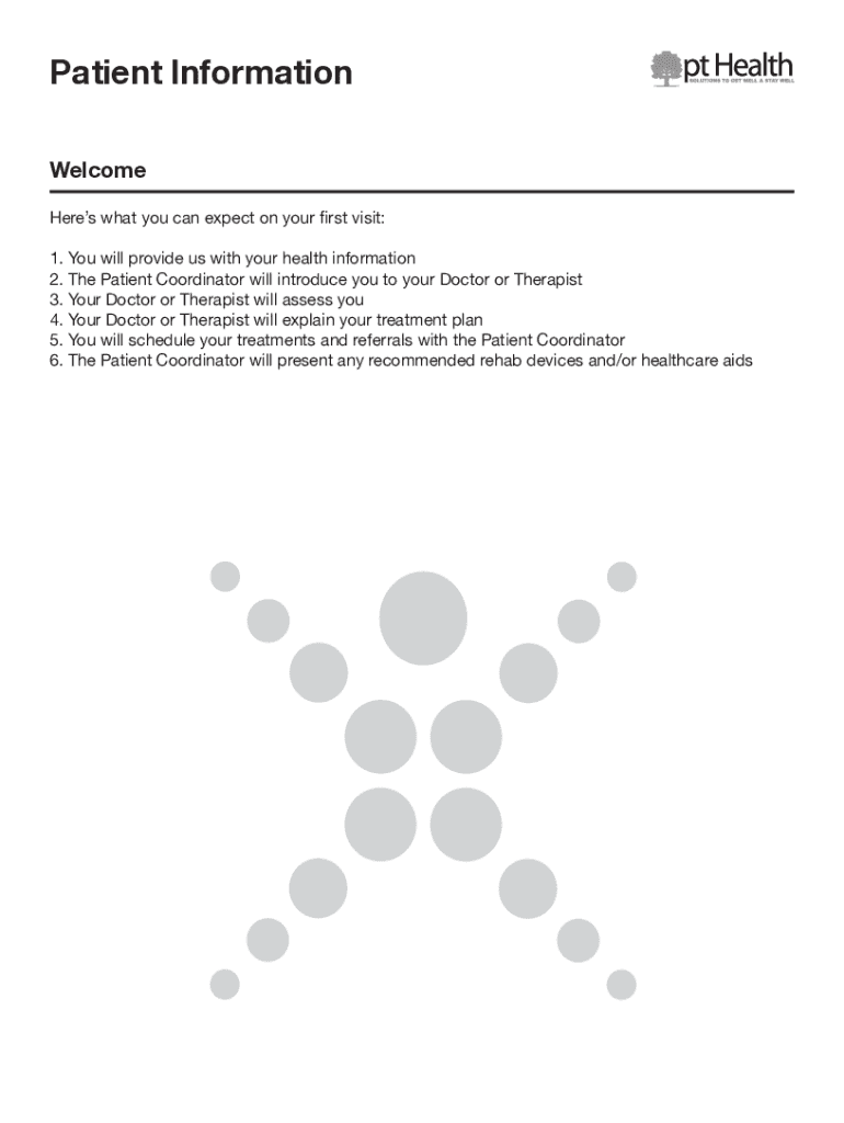 Patient Information Welcome Here's what you can expect on your first visit: 1. You will provide us with your health information 2. The Patient Coordinator will introduce you to your Doctor or Therapist