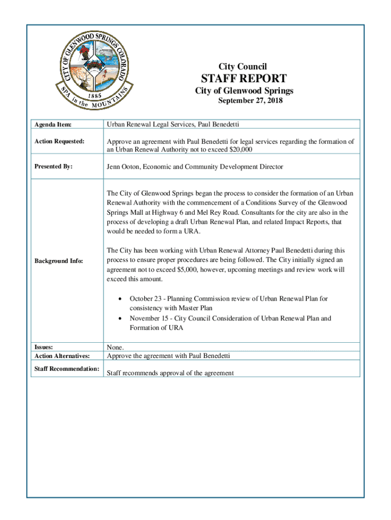 City CouncilSTAFF REPORT City of Glenwood Springs September 27, 2018, Agenda Item:Urban Renewal Legal Services, Paul BenedettiAction Requested:Approve an agreement with Paul Benedetto for legal services